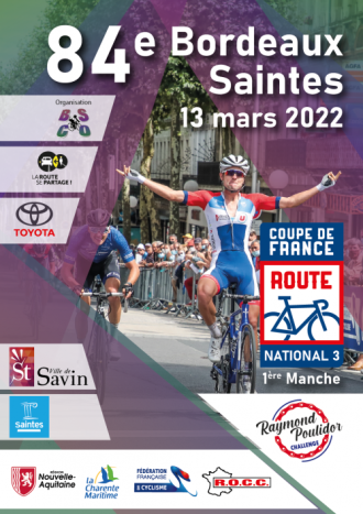 jeudi 10 mars 2022 Illustration de Bordeaux-Saintes : Les engagés Route Bordeaux-Saintes : Les engagés lu La 84e édition de la classique Bordeaux-Saintes, première manche de la Coupe de France N3, se déroulera ce dimanche 13 mars. L'épreuve se disputera entre Saint-Savin (Gironde) et Saintes (Charente-Maritime). Au programme : 137,2 km en ligne et 4 tours de circuit de 7,8 km soit une distance totale de 168,4 kilomètres. Le départ fictif sera donné à 12h10, le réel à 12h15. La victoire était revenue l'an dernier à Sandy...