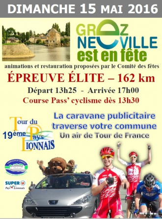 vendredi 13 mai 2016 Illustration de Tour du Lionnais : Les engagés Route Tour du Lionnais : Les engagés lu Le Vélo Club Lionnais organise ce dimanche à Grez-Neuville (Maine-et-Loire) le 19e Tour du Lionnais (Elite Nationale). Au programme : 117,2 km en ligne + 5 tours de 9,1 km soit 162,7 kilomètres. Le départ fictif sera donné à 13h25, le réel à 13h35. Florian Maître (Vendée U) avait remporté l'édition 2015. Retrouvez ci-dessous la liste des engagés et plus d'informations sur www.cotcccrl.fr.La liste des engagés...