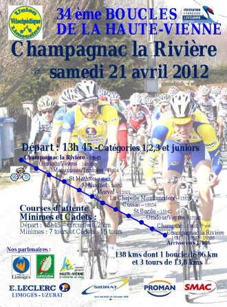 jeudi 19 avril 2012 Illustration de Boucles de la Haute-Vienne : Les engagés Route Boucles de la Haute-Vienne : Les engagés lu Les 34e Boucles de la Haute-Vienne se disputent ce samedi dans le Limousin. Le départ et l'arrivée auront lieu à Champagnac-la-Rivière dans le Sud du département de la Haute-Vienne. Au programme de l'épreuve toutes catégories : une boucle en ligne de 96 km puis 3 tours de 13,8 km pour un total de 138 km. Le départ sera donné à 13h45. La victoire était revenue l’an dernier Yohan Soubes (CC Périgueux...