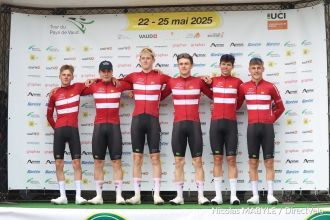 jeudi 22 mai 2025 Crédit photo Nicolas Mabyle / DirectVelo Route Tour du Pays de Vaud - Et. 1 : Classements lu L'équipe du Danemark a remporté, ce jeudi, le contre-la-montre par équipes inaugural de la 54e édition du Tour du Pays de Vaud (Suisse), manche de la Coupe des Nations Juniors. Ce chrono, urbain, se disputait dans les rues de Lausanne sur la courte distance de 4,6 kilomètres. La Suisse et les Pays-Bas complètent le podium. Malthe Risbjerg s'empare du premier maillot jaune de leader. Classement de la 1ère étape :1. Danemark les 4,6 km en...