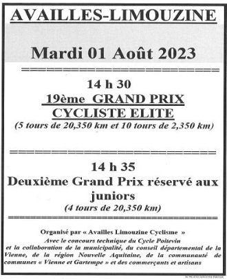 samedi 29 juillet 2023 Illustration de Grand Prix d'Availles-Limouzine : Les engagés Route Grand Prix d'Availles-Limouzine : Les engagés lu Le 19e Grand Prix d'Availles-Limouzine (Élite Nationale) se dispute ce mardi 1er août dans le département de la Vienne. Au programme : 5 tours de 20,350 km et 10 tours de 2,350 km soit un total de 125,250 kilomètres. Le départ sera donnée à 14h30. Le vainqueur succédera à Sten Van Gucht (voir classement). Retrouvez ci-dessous la liste des engagés de l’épreuve organisée par Availles Limousine Cyclisme et le Cycle...