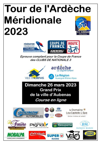 dimanche 26 mars 2023 Crédit photo Nicolas Mabyle - DirectVelo Route Tour de l'Ardèche Méridionale : Classement lu Romain Hardy (UC Briochine-Bleu Mercure) a remporté, ce dimanche, le Tour de l'Ardèche Méridionale, première manche de la Coupe de France N3. Après 163 kilomètres de course entre Vogüé et Aubenas (Ardèche), il a devancé Baptiste Cherion (Issoire Cyclisme) et Grégory Pauchet (VC Amateur Saint-Quentin).Classement :1. HARDY Romain UC BRIOCHINE BLEU MERCURE les 163 km en 4h02'49'' (moy. 40,277 km/h)2. CHERION Baptiste ISSOIRE...