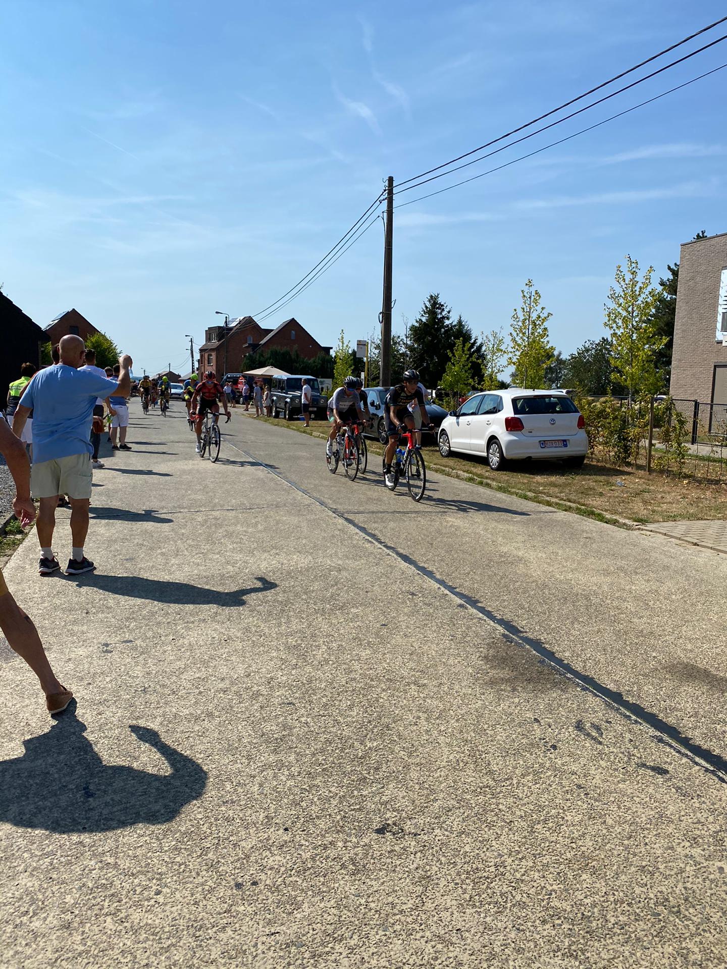 Chute de Vince GERITS (Stageco CT), Vinny BZDENGA (Heist Cycling Team), Simon DEHAIRS (GM Recycling) et du maillot blanc Tom PAQUOT (Wallonie-Bruxelles Development Team)
