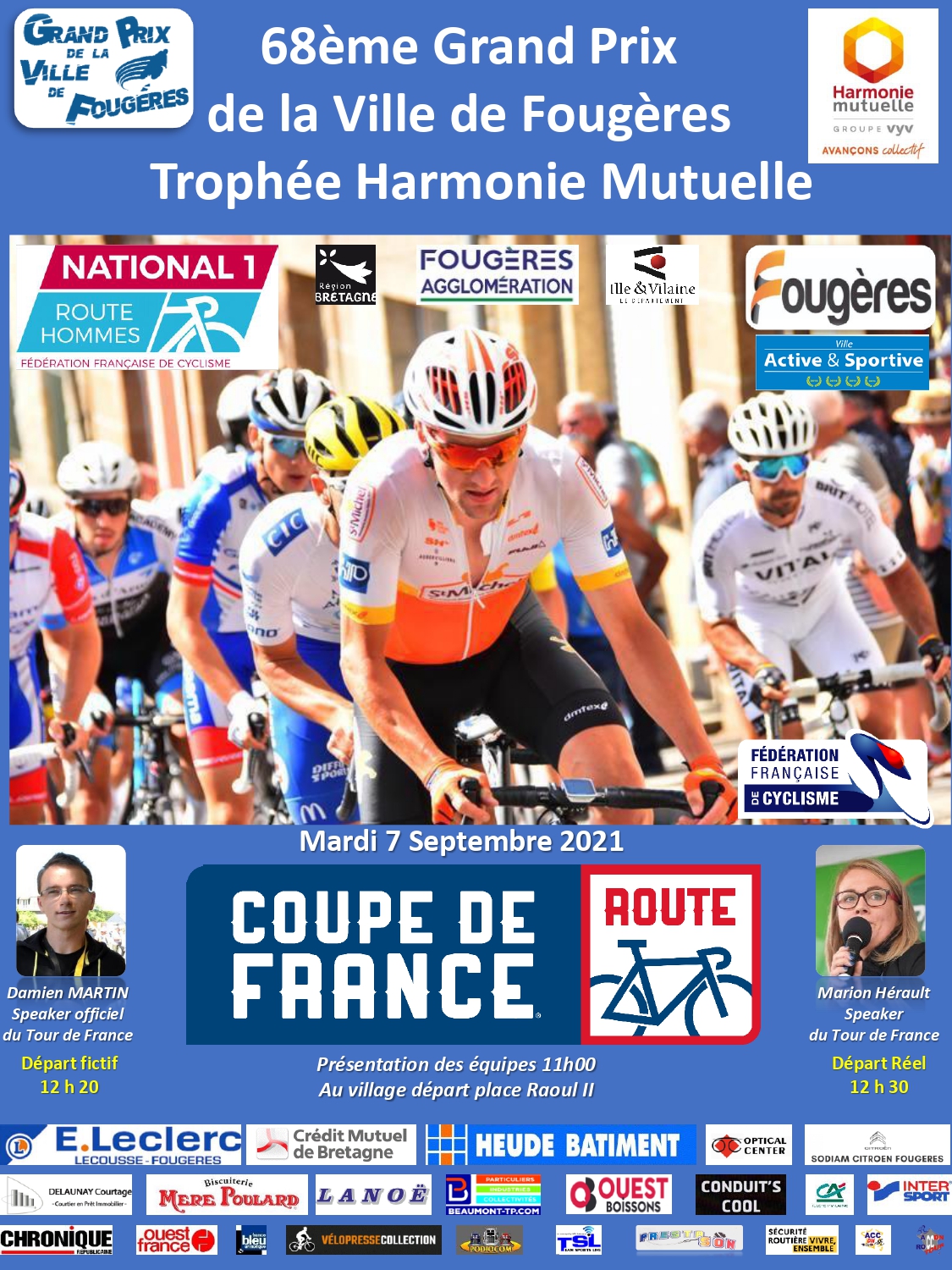 La 68e édition du Grand Prix de la Ville de Fougères-Trophée Harmonie Mutuelle, troisième et dernière manche de la Coupe de France N1, se dispute ce mardi 7 septembre dans le département d'Ille-et-Vilaine. Au programme : un circuit de 27 km à parcourir 4 fois puis un circuit de 9,430 km à effectuer 7 fois soit une distance totale de 174,010 kilomètres. Le départ fictif sera donné à 12h20, le réel à 12h30. La victoire était revenue en 2019 à Maxime Chevalier. Le VC Rouen 76 occupe la tête de la Coupe de France N1 (voir classement). Toutes les informations en cliquant ici.