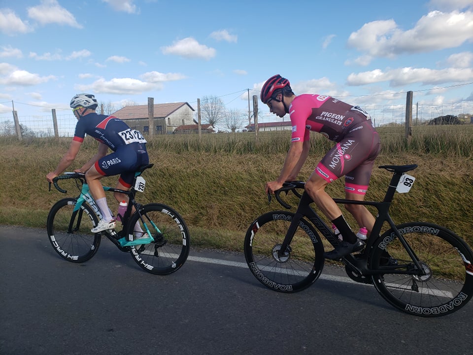 Jonction en tête de course ! Florian RAPITEAU (Laval Cyclisme 53) et Estéban MIOMANDRE (Paris Cycliste Olympique) sont les deux hommes de tête.