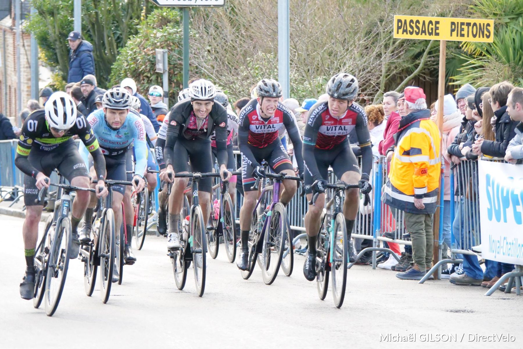 Ils sont 5 en tête avec la présence de Lomig LE CLEC'H (Cre'Actuel-Marie Morin-U 22), Antoine HUBY (Vendée U), Guerand LE PENNEC (VC Pays de Loudéac), Pierre THIERRY (Morbihan Fybolia GOA), et Franck DAUDIN GUÉNÉGOU (UCK Bretagne Sud Cyclisme).