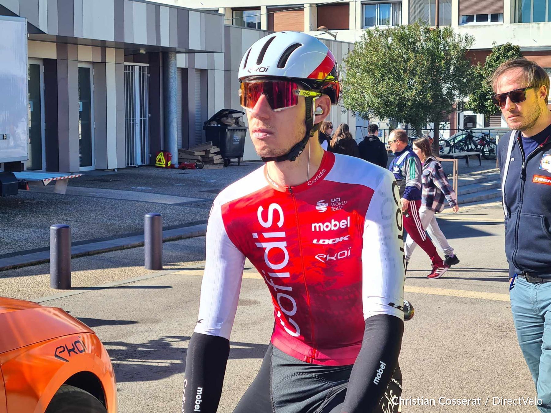 Alex KIRSCH (Lidl-Trek) est descendu à la voiture pour avoir les dernières informations avant l'emballage final.