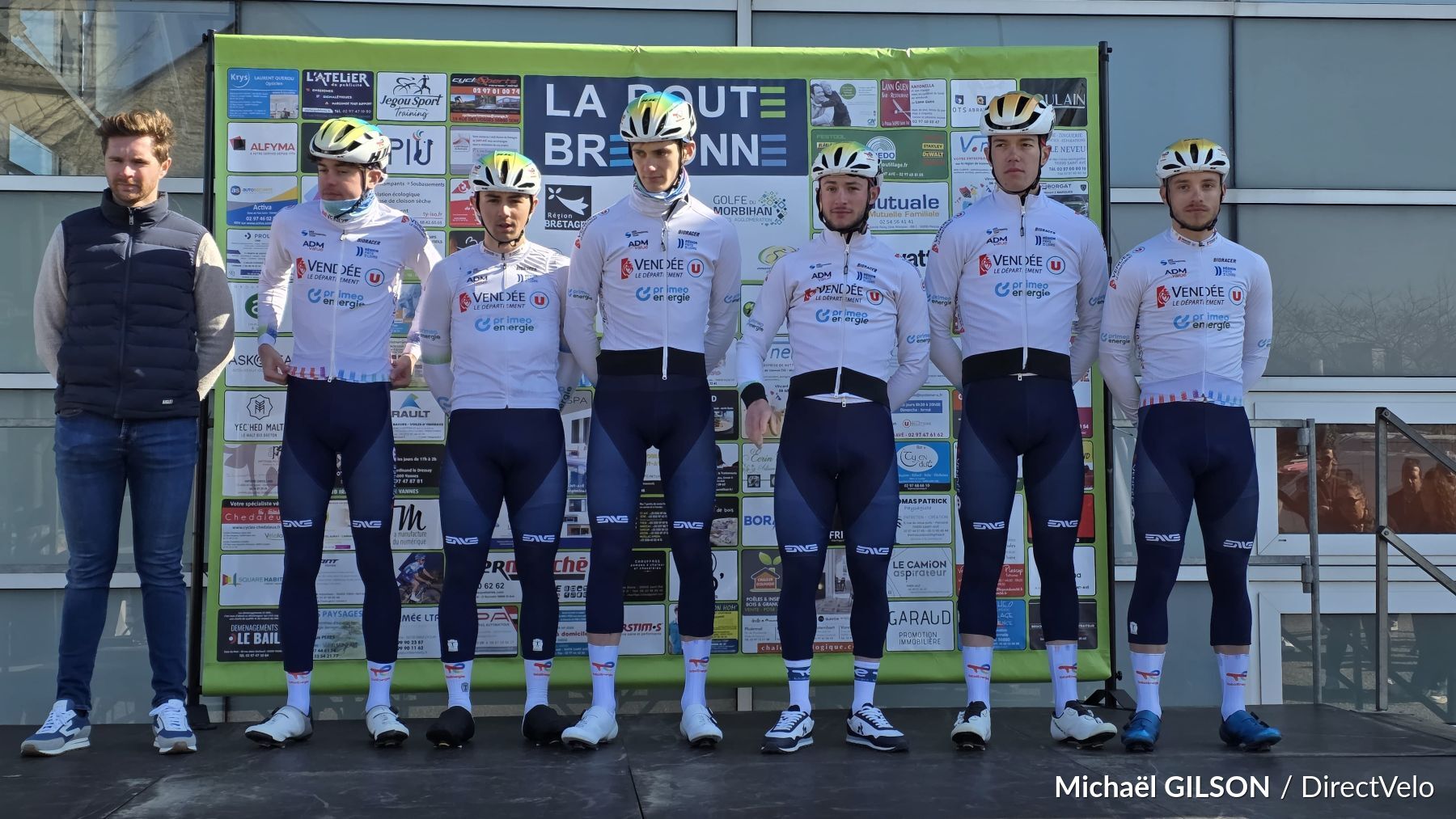 En tête : Florian GAILLARD I (Dinan Sport Cycling), Gaëlig GLON, Théo JOSSO (Team Adris-La Crêpe de Brocéliande-BLC), Aymeric QUÉRÉ (Team Pays de Briec), Pierre CHOBLET, Ivann RAVALEU (VC Pays de Loudéac), Léandre HUCK (VC Rouen 76) et Evan PAVIS (Vendée U)