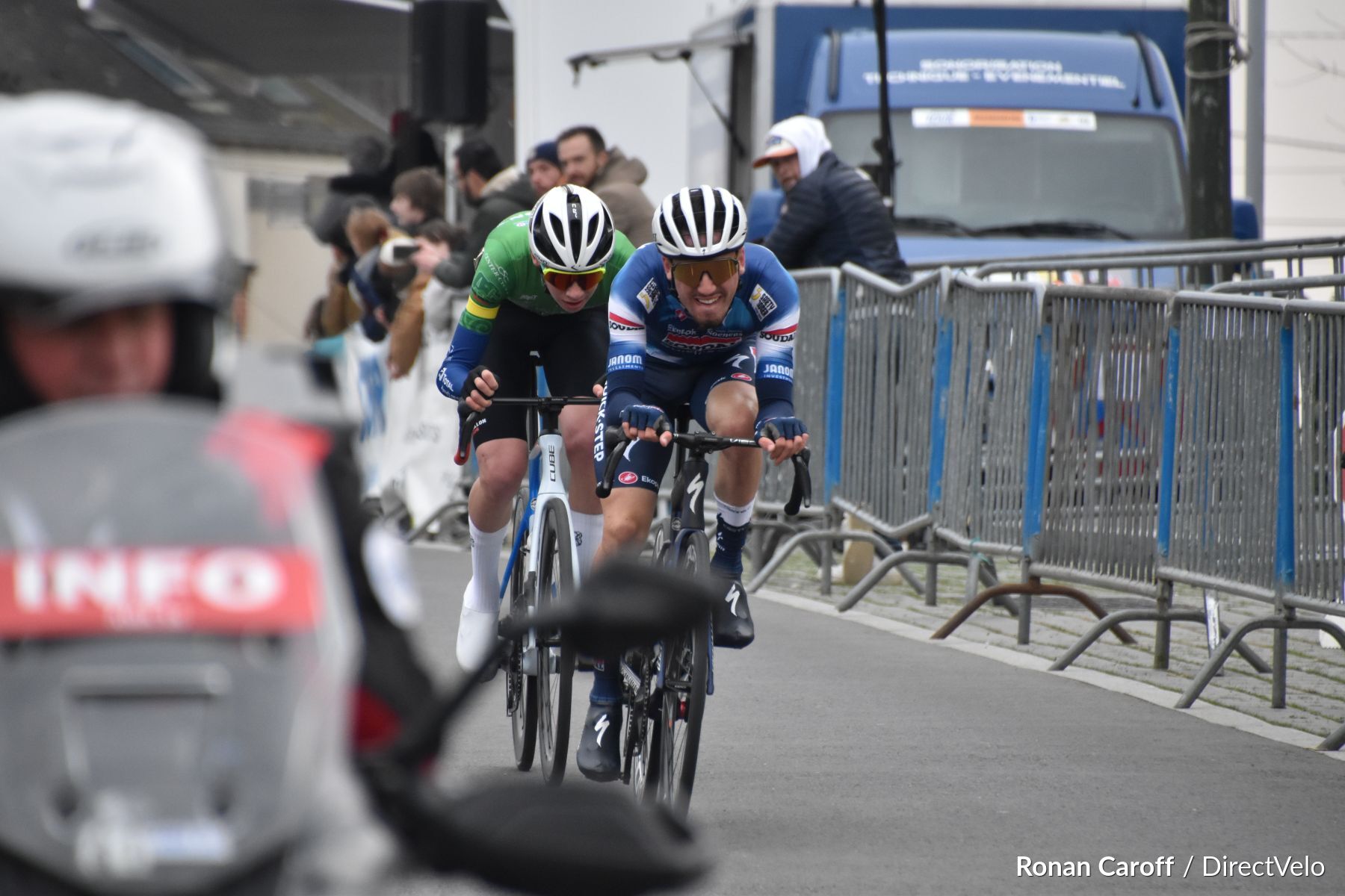 Elouann PERRU (Team Côte de Granit Rose) et Augustin BEUNEUX (Association Cycliste Noyal-Châtillon) lâchés.