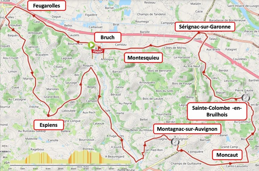 Le contre-la-montre est composé d'une boucle de 47.8 km à parcourir autour de Bruch (Lot-et-Garonne). La première équipe s'élancera à 13h30.