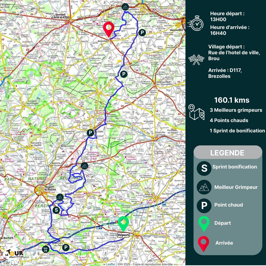 Les coureurs vont parcourir 160,1 kilomètres entre Brou et Brezolles. Le départ fictif sera donné à 13h00 et le réel à 13h14.