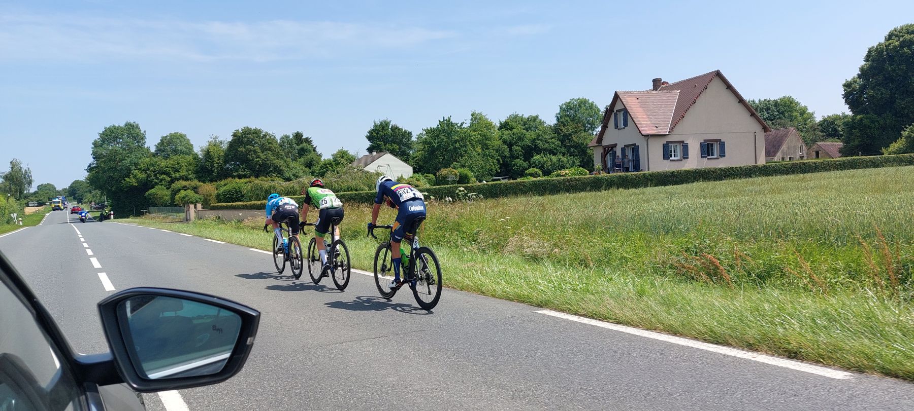 En tête au kilomètre 43 : Esteban FOUCHER (VC Rouen 76), Grégoire MAHIEU (AVC Aix Provence Dole) et Felipe TORO ZULUAGA (Colombie).