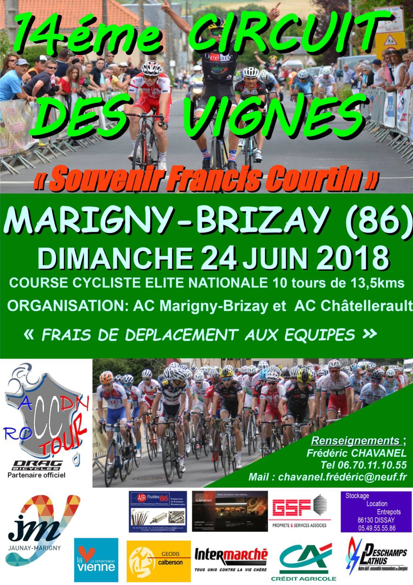 La 14e édition du Circuit des Vignes (Elite Nationale) se dispute ce dimanche à Marigny-Brizay dans le département de la Vienne. Au programme de la course organisée par l'AC de Marigny-Brizay et l'AC Châtelleraudais : 10 tours de 13,2 km soit 132 kilomètres. Le départ fictif sera donné à 13h45, le réel à 13h47. La victoire était revenue l'an dernier à Ewen Henrio, alors au Guidon Chalettois et désormais VC Pays de Loudéac. Plus d'informations en cliquant ici.