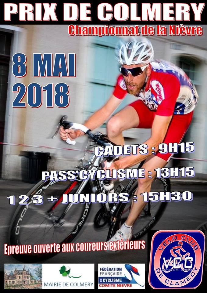 Le Prix de Colméry, support du Championnat de la Nièvre, se dispute ce mardi 8 mai. Au programme de l'épreuve toutes catégories : un circuit de 7,5 km à parcourir 11 fois soit 82,5 kilomètres. Le départ sera donné à 15h30.