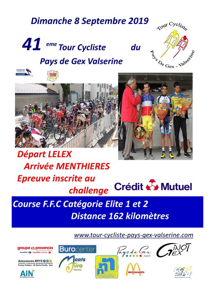 La 41e édition du Tour du Pays de Gex-Valserine (Elite Nationale) se dispute dimanche dans le département de l'Ain. 164,3 kilomètres entre Lélex et la station de Menthières figurent au programme. Le départ fictif sera donné à 12h50, le réel à 13h00. La victoire était revenue l'an dernier à Rémy Rochas, alors à Bourg-en-Bresse Ain Cyclisme et désormais pro chez Delko Marseille Provence. Toutes des informations sur www.tour-cycliste-pays-gex-valserine.com.
