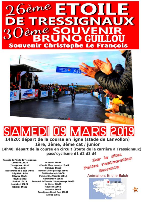 La 26e édition de l'Etoile de Tressignaux se dispute ce samedi dans le département des Côtes d'Armor. 137,6 kilomètres attendent les coureurs (une boucle de 101,6 km puis 8 tours de 4,5 km). Le départ fictif sera donné à 14h20 et le réel à 14h30. La victoire était revenue l'an dernier à Alexis Renard (Côtes d'Armor-Marie Morin-Véranda Rideau). Retrouvez ci-dessous la liste des engagés de l'épreuve toutes catégories organisée par les Amis du Vélo avec l'aide du Comité des fêtes de Tressignaux et l'UC Briochine. Toutes les informations sur www.etoiledetressignaux.com.