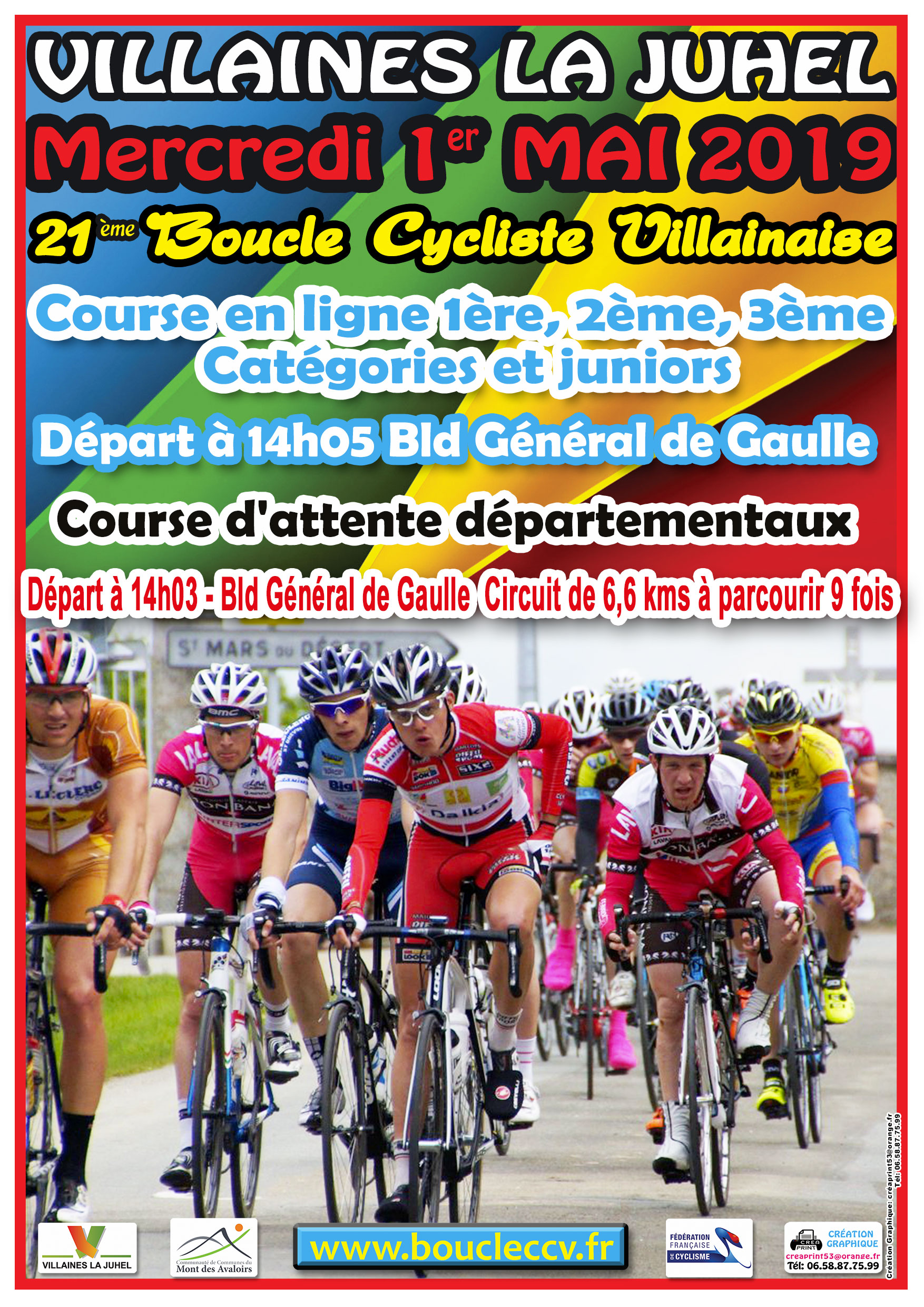 La 21e édition de la Boucle Cycliste Villainaise se dispute ce mercredi 1er mai à Villaines-la-Juhel (Mayenne). 124,5 kilomètres -une boucle de 82 km puis 5 tours de 8,5 km- attendent les coureurs. Le départ sera donné à 14h10. La victoire de l'épreuve toutes catégories était revenue l'an dernier à Clément Mary (Laval Cyclisme 53). Tous les détails sur www.boucleccv.fr.
