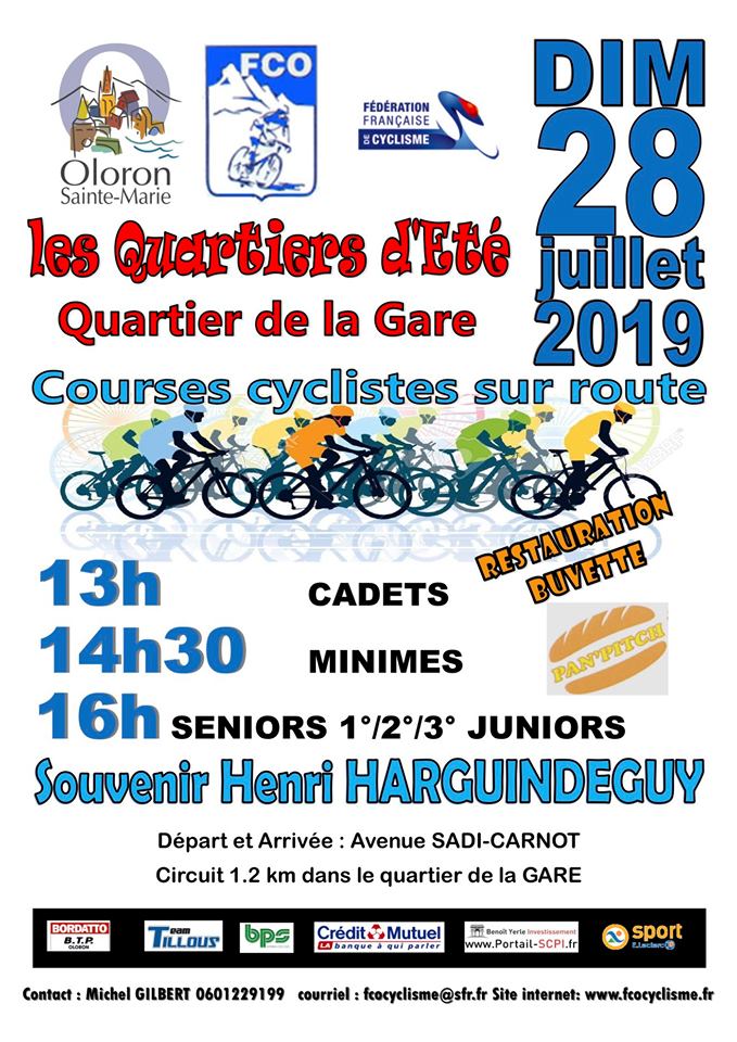 Le FC Oloron Cyclisme organise dimanche le Prix des Quartiers d'Eté à Oloron-Sainte-Marie dans le département des Pyrénées-Atlantiques. Au programme de l'épreuve toutes catégories : un circuit de 1,185 km à effectuer 75 fois pour une distance totale de 88,875 kilomètres. Le départ sera donné à 16h00. La victoire était revenue l'an dernier à Pierre Créma, alors au Team Cycliste Dordogne Sud et désormais au CC Marmande 47.