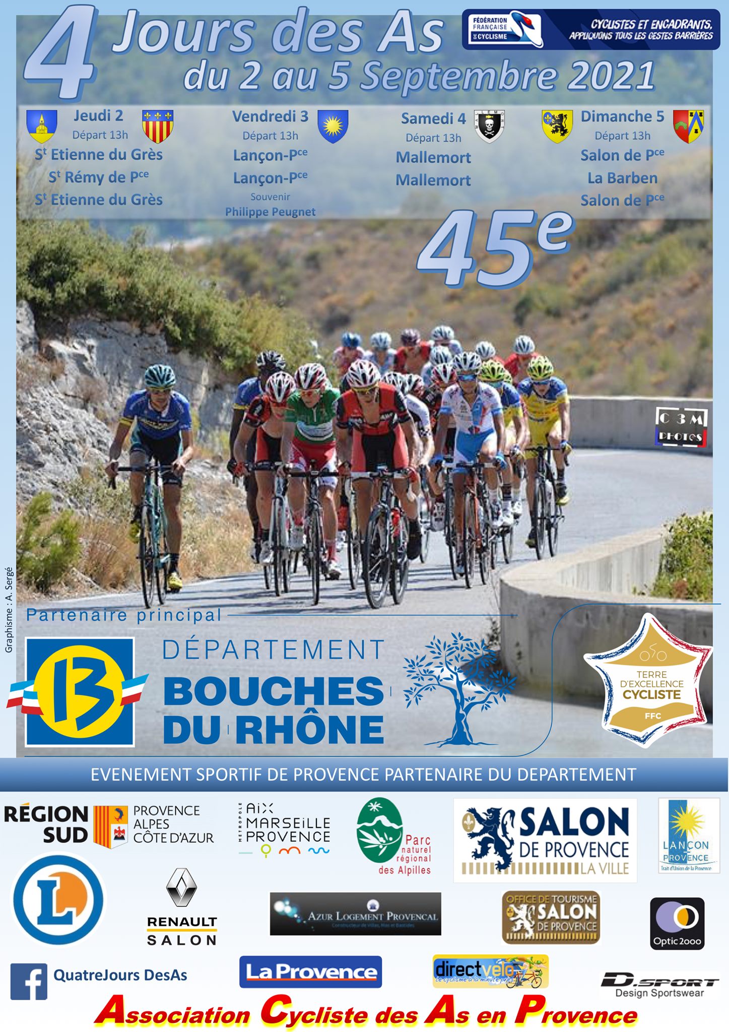 La 45e édition des 4 Jours des As-en-Provence se dispute du jeudi 2 au dimanche 5 septembre dans les Bouches-du-Rhône. Quatre étapes en ligne figurent au programme de l'épreuve Elite Nationale. Le vainqueur succédera à Lucas Papillon (voir classements). Toutes les informations en cliquant ici.