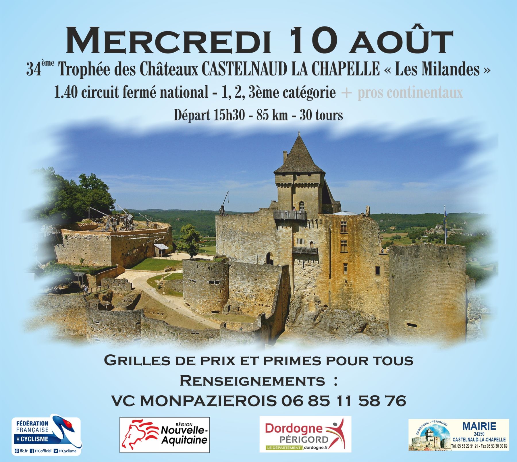 Le VC Monpazièrois organise ce mercredi 10 août, à Castelnaud-la-Chapelle (Dordogne), la 34e édition du Trophée des Châteaux aux Milandes (1.40). Au programme : un circuit de 2,830 km à parcourir 30 fois soit 84,9 kilomètres. Le départ sera donné à 15h30. La victoire était revenue l'an dernier à Clément Jolibert (voir classement).