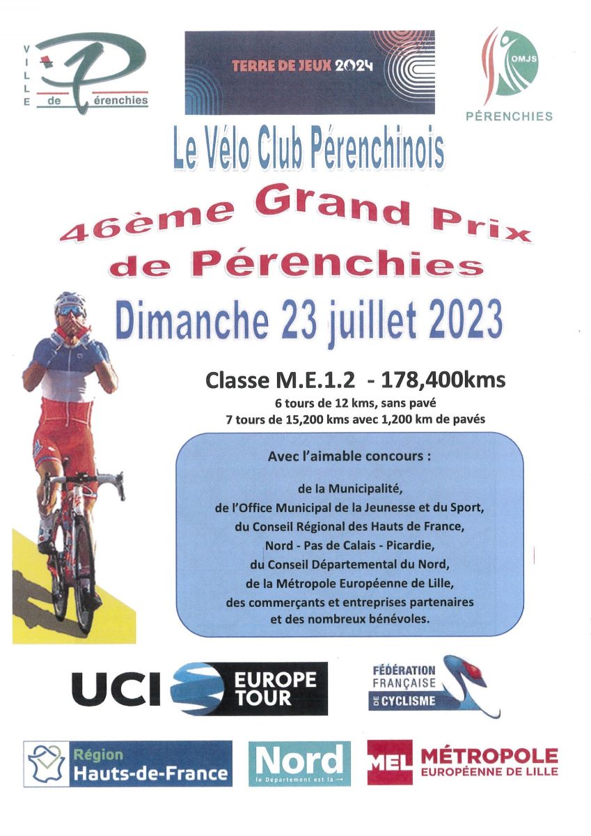 La 46e édition du Grand Prix de la ville de Pérenchies (1.2) se dispute le dimanche 23 juillet dans le département du Nord. Au programme : 6 tours sans pavés de 12 km plus 7 tours de 15,2 km avec 1 secteur pavés de 1.2 km, pour un total de 178,4 kilomètres. Le départ fictif sera donné à 13h30 et le réel à 13h33. La victoire était revenue l'an dernier au Néo-Zélandais Laurence Pithie (voir classement).