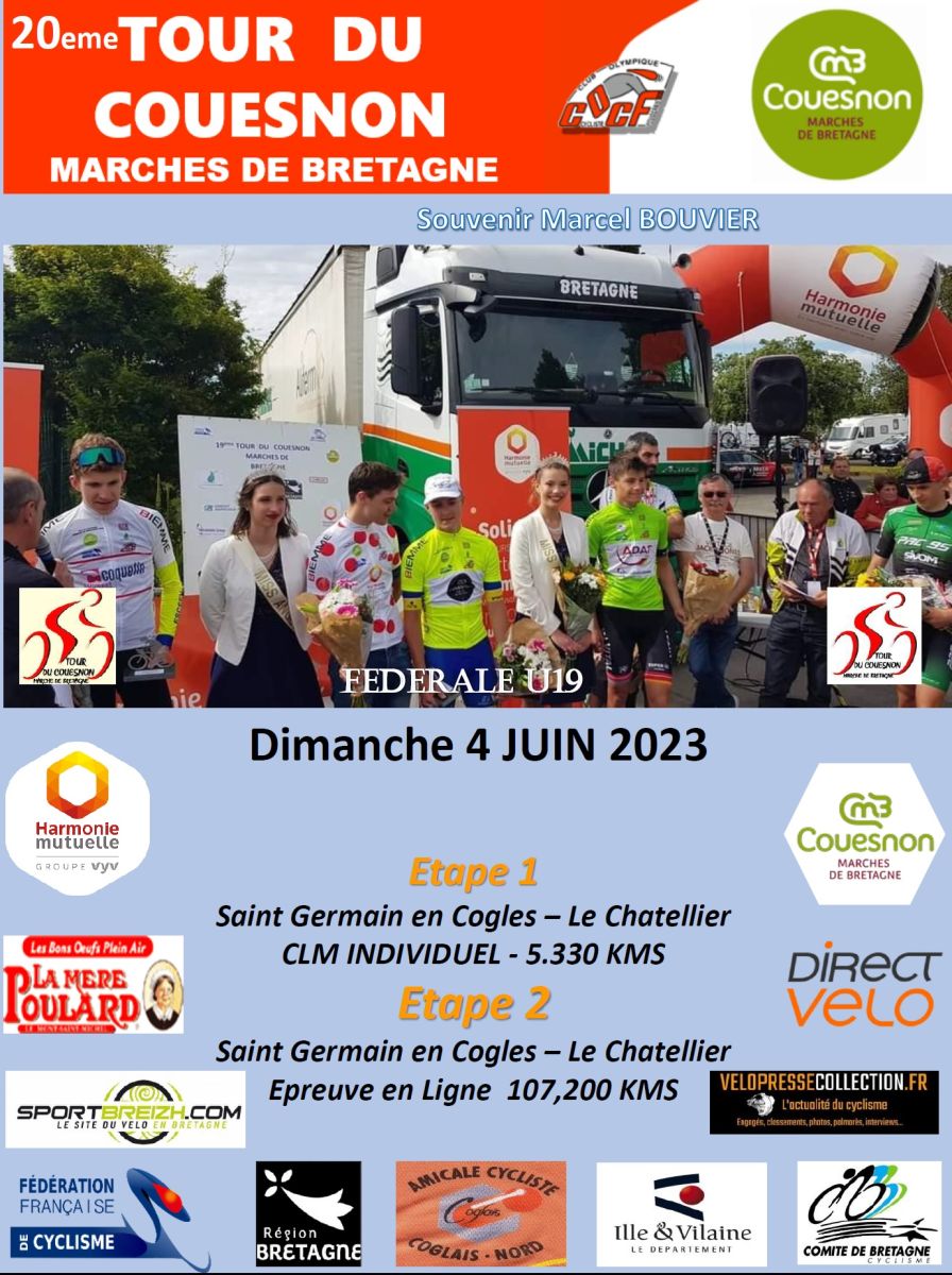 La 20e édition du Tour du Couesnon Marches de Bretagne-Souvenir Marcel-Bouvier a lieu en Ille-et-Vilaine le dimanche 4 juin. Deux étapes figurent au programme de l'épreuve Fédérale Juniors, un contre-la-montre individuel et une étape en ligne (62,7 km et cinq tours de 8,9 km). Le lauréat succédera à Enzo Briand (voir classements). Toutes les informations en cliquant ici.