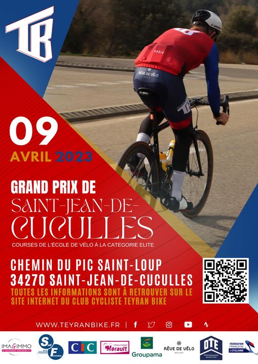 Le Grand Prix de Saint-Jean-de-Cuculles se dispute ce dimanche 9 avril dans le département de l'Hérault. Au programme de l'épreuve Élite, Open 1-2-3 et Access : un circuit de 3,070 km à effectuer 29 fois pour une distance totale de 89,030 kilomètres. Le départ sera donné à 15h. Toutes les informations sur www.teyranbike.fr.