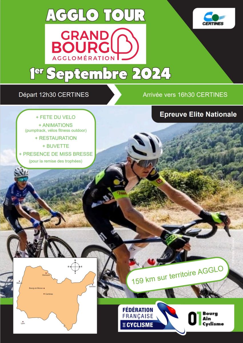 Le Tour Agglo Bourg-en-Bresse (Élite Nationale) se dispute le dimanche 1er septembre à Certines (Ain). 159,7 kilomètres -74,7 km en ligne et un circuit de 17 km à effectuer 5 fois- sont au programme de l'épreuve. Le départ fictif sera donné à 12h30 et le réel à 12h42. La victoire était revenue l'an dernier à Henri-François Haquin (voir classement). Toutes les informations en cliquant ici.