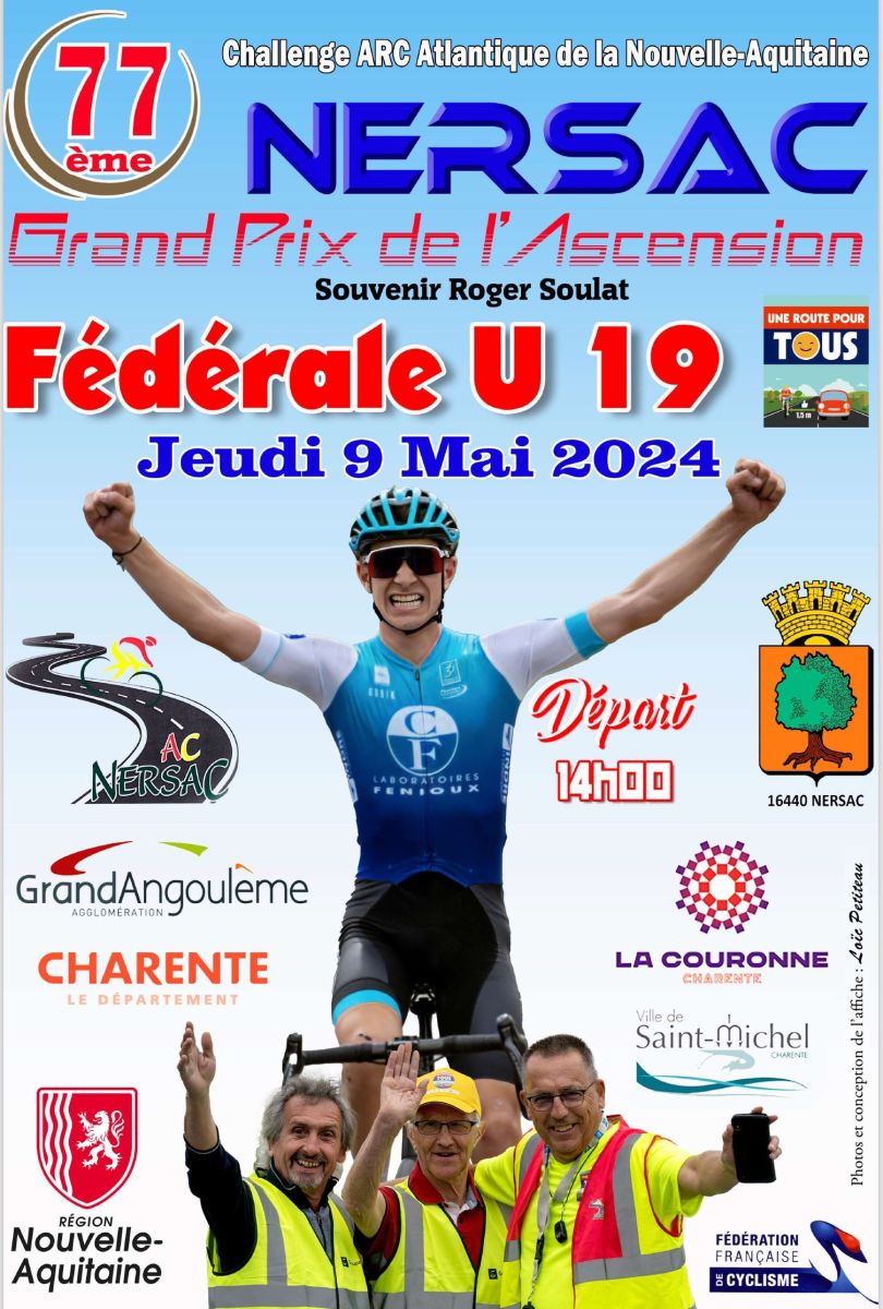 La 77e édition du Grand Prix de l'Ascension-Souvenir Roger Soulat (Fédérale Juniors) se dispute ce jeudi 9 mai à Nersac (Charente). Au programme : 10 tours de 11,9 km soit 119 kilomètres. Le départ sera donné à 14h30. Le vainqueur succédera à Thibaud Duret (voir classement). Toutes les informations en cliquant ici.