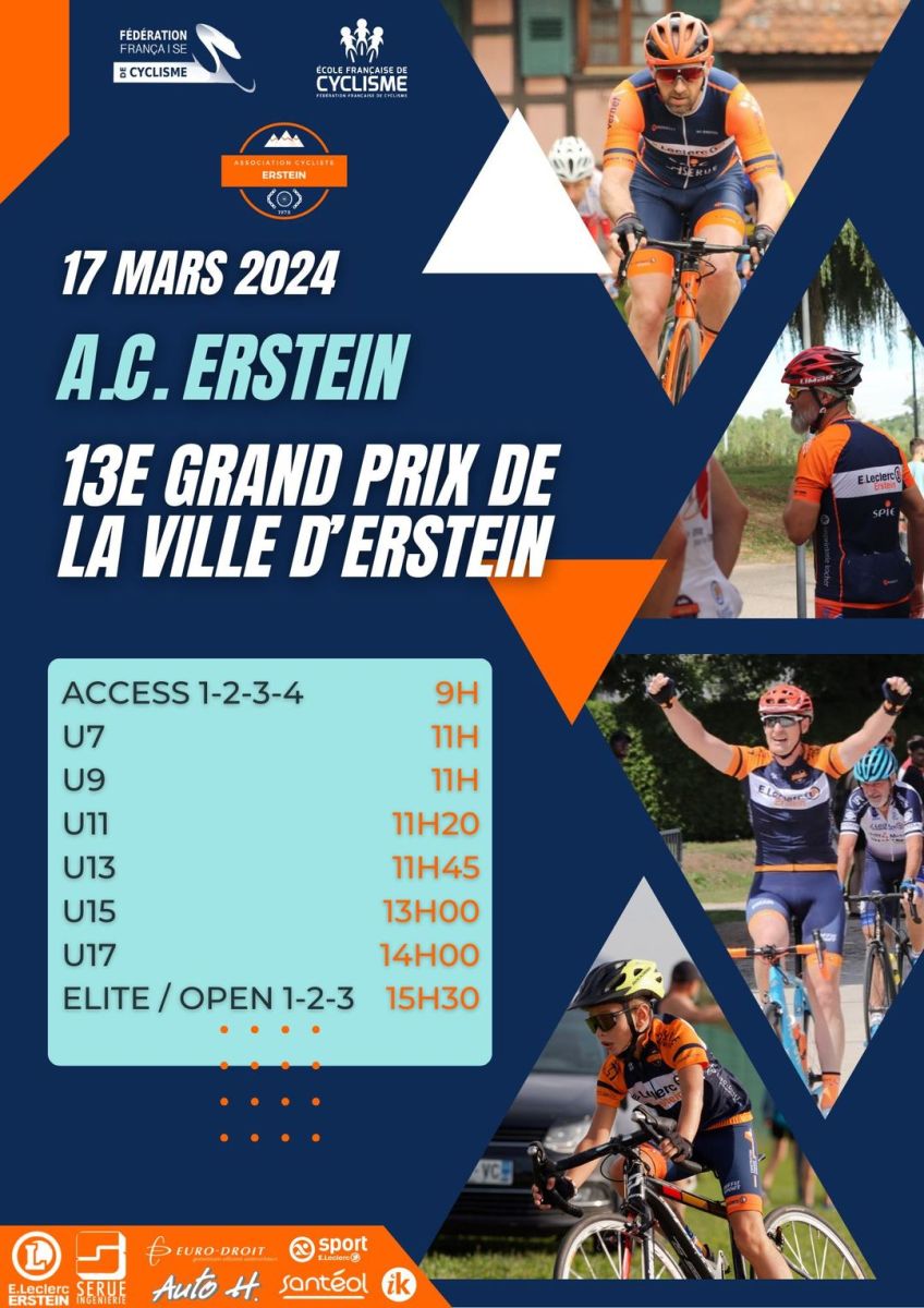 L'Association Cycliste Erstein organise ce dimanche 17 mars la 13e édition du Grand Prix d'Erstein (Bas-Rhin). Au programme de l’épreuve Élite et Open 1-2-3 : un circuit de 4 km à parcourir 30 fois soit 120 kilomètres. Le départ sera donné à 15h30. Le vainqueur succèdera au palmarès au Grec Emiliano Vila (voir classement). Toutes les informations sur www.acerstein.fr.