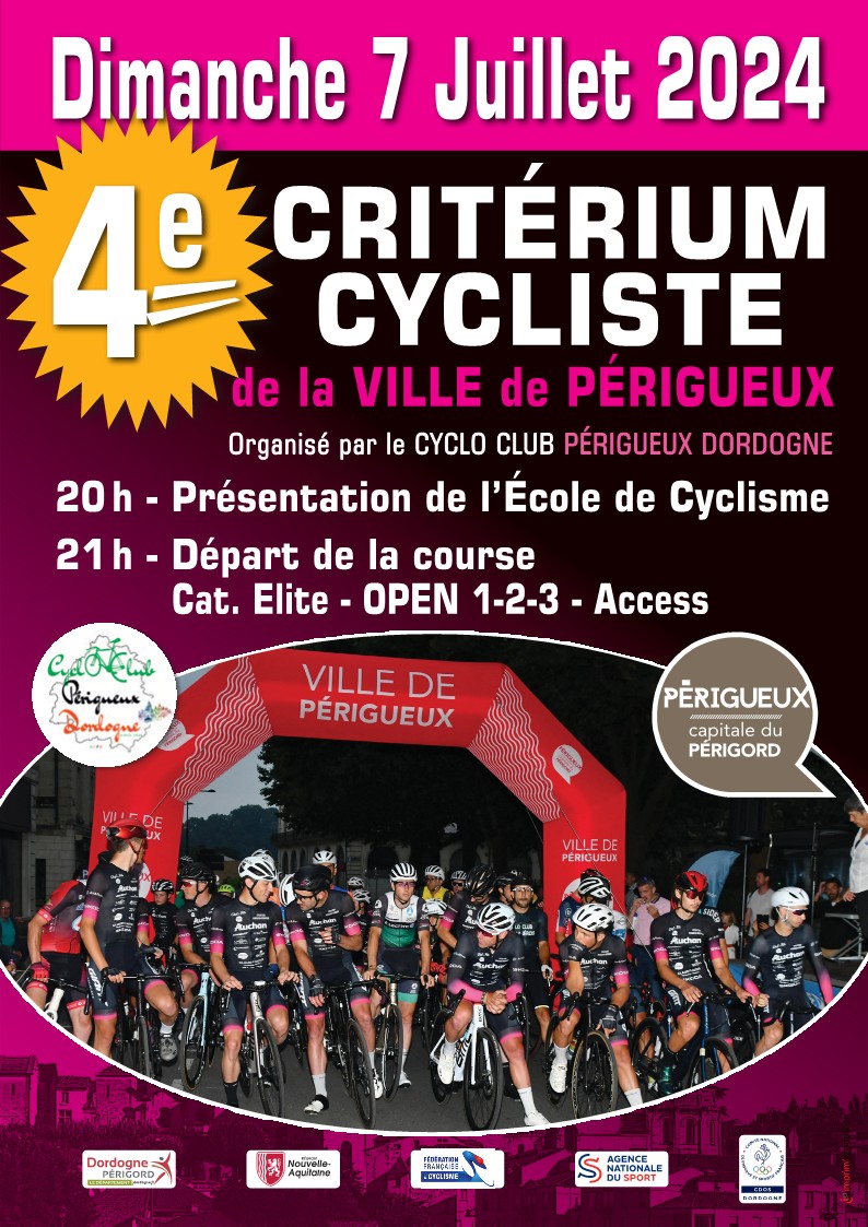 La quatrième édition du Critérium de la Ville de Périgueux (Dordogne) se dispute ce dimanche 7 juillet. Au programme de la course organisée par le CC Périgueux Dordogne : un circuit de 1,053 km à parcourir 76 fois soit 80 kilomètres. Le départ de l'épreuve Élite, Open 1-2-3 et Access 1-2-3-4 sera donné à 21h. Le lauréat succédera à Killian Larpe (voir classement).