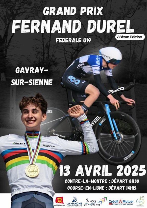 La 23e édition du Grand Prix Fernand Durel se disputera le dimanche 13 avril autour de Gavray-sur-Sienne (Manche). Un contre-la-montre et une étape en ligne figurent au programme de l'épreuve Fédérale U19. La victoire était revenue l'an dernier à Paul Seixas (voir classements). Toutes les informations en cliquant ici.