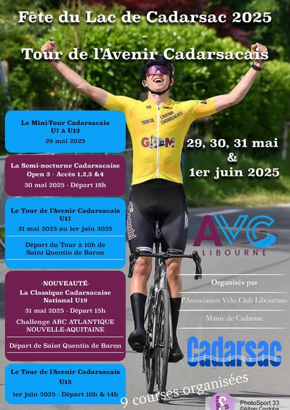 L'AVC Libourne organise, le samedi 31 mai, à Cadarsac (Gironde), la première édition de la Classique Cadarsaquaise (Fédérale Juniors). Au programme : 104,2 kilomètres. Le départ sera donné à 15h depuis la commune de Saint-Quentin-de-Baron, et l'arrivée sera jugée à Cadarsac.