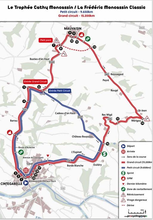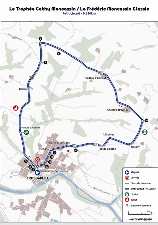 La Frédéric Moncassin Classic (Fédérale Juniors), se dispute ce samedi 22 mars à Cintegabelle dans le département de la Haute-Garonne. Un contre-la-montre individuel le matin de 9,650 kilomètres et une étape en ligne l'après-midi (5 tours de 15,2 km et 3 tours de 9,650 km = 104,950 km) sont au programme de l'épreuve. Toutes les informations sur www.gscblagnac-velosport31.fr.