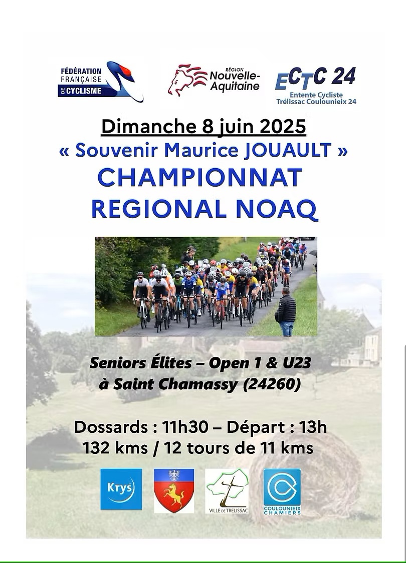 L'EC Trélissac Coulounieix 24 organise le dimanche 8 juin, à Saint-Chamassy (Dordogne), le Championnat de Nouvelle-Aquitaine. Au programme de l'épreuve réservée aux Élites, Open 1 et U23 : un circuit de 11 km à effectuer 12 fois soit 132 kilomètres. Le départ sera donné à 13h. Thomas Bibet (CO Couronnais) avait remporté l'an dernier le titre de Champion de Nouvelle-Aquitaine (voir classement). Toutes les informations en cliquant ici.