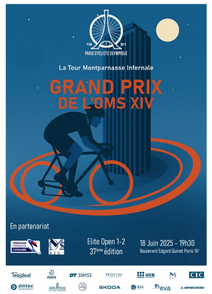 Le 37e Prix de l'OMS Paris 14e se dispute ce mercredi 18 juin, au pied de la tour Montparnasse. Au programme de l'épreuve organisée par le Paris Cycliste Olympique : un circuit de 1,2 km à effectuer 62 fois, soit 74,4 kilomètres. Le départ de l’épreuve Élite et Open 1-2. sera donné à 19h30. La victoire était revenue l’an dernier à Dylan Durand.