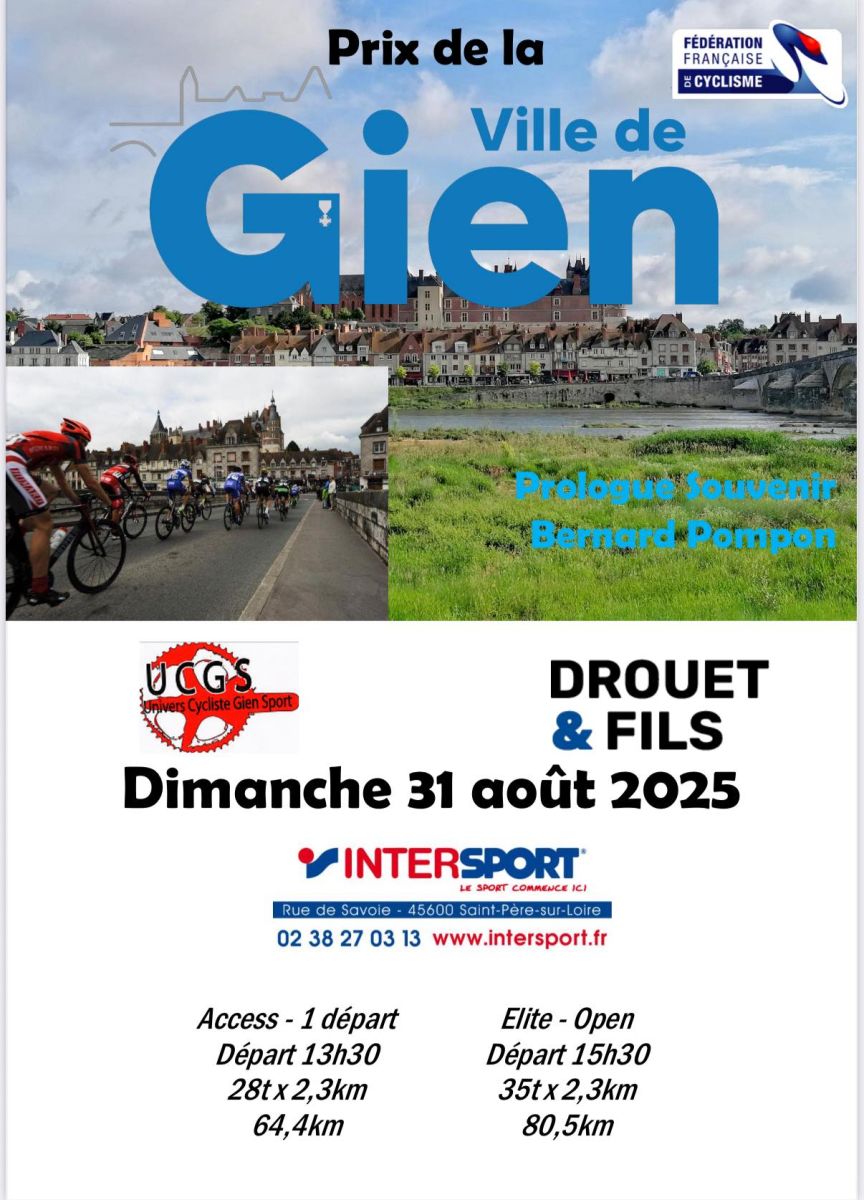 Le Grand Prix de Gien se dispute le dimanche 31 août dans le département du Loiret. Au programme de épreuve Élite et Open : un circuit de 2,3 km à parcourir 35 fois soit 80,5 kilomètres. Le départ sera donné à 15h30. La victoire était revenue l'an dernier à Louis Hardouin.