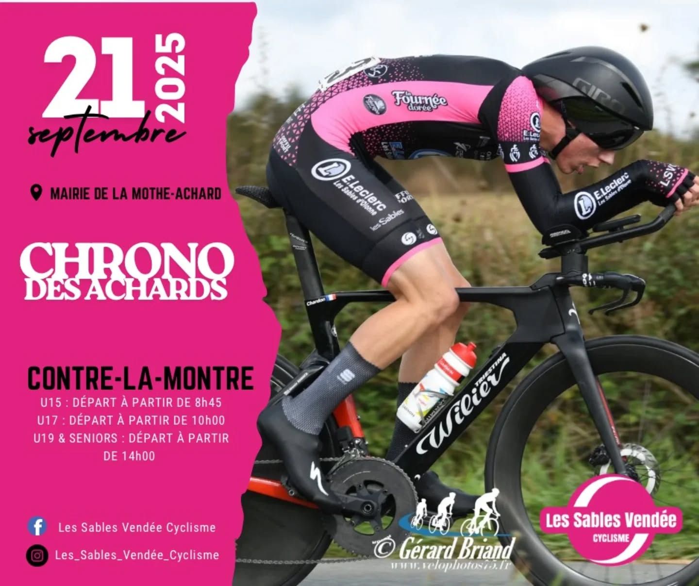 Les Sables Vendée Cyclisme organisent ce dimanche 21 septembre le Chrono des Achards disputé autour de la Mothe-Achard (Vendée). 21,2 kilomètres sont au programme de l'épreuve Élite et U19 chronométrée. Grégory Pouvreault a remporté la dernière édition. Le contre-la-montre servira de support au Championnat de Vendée.