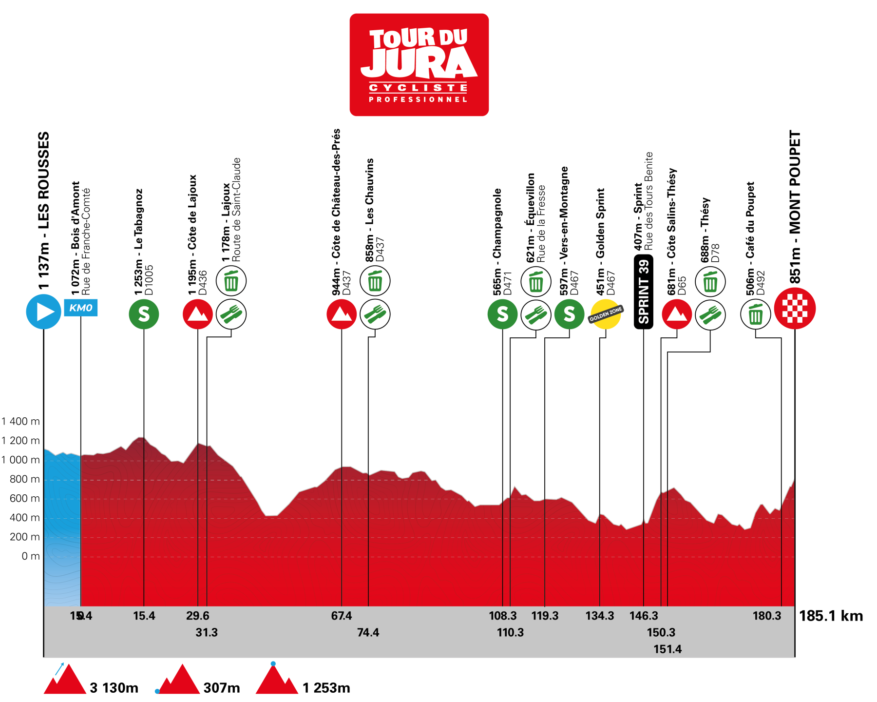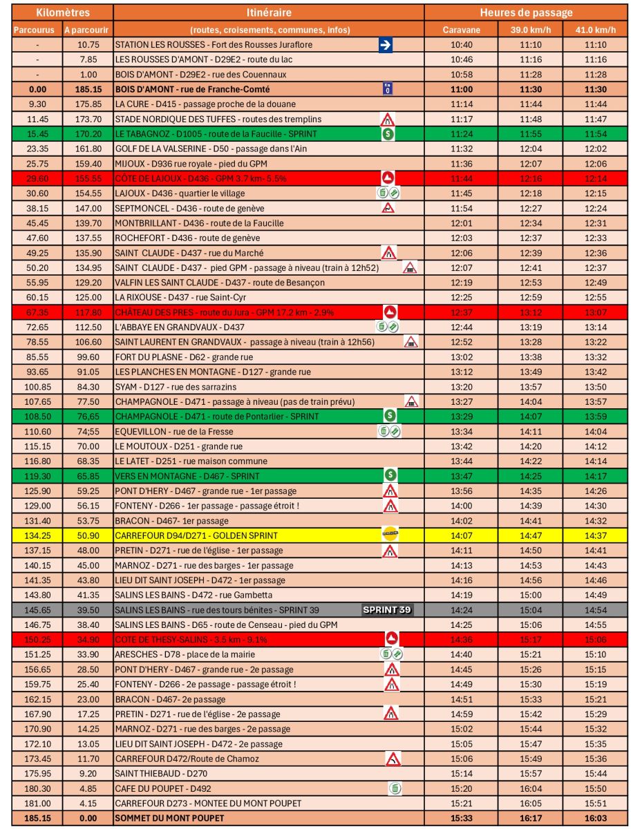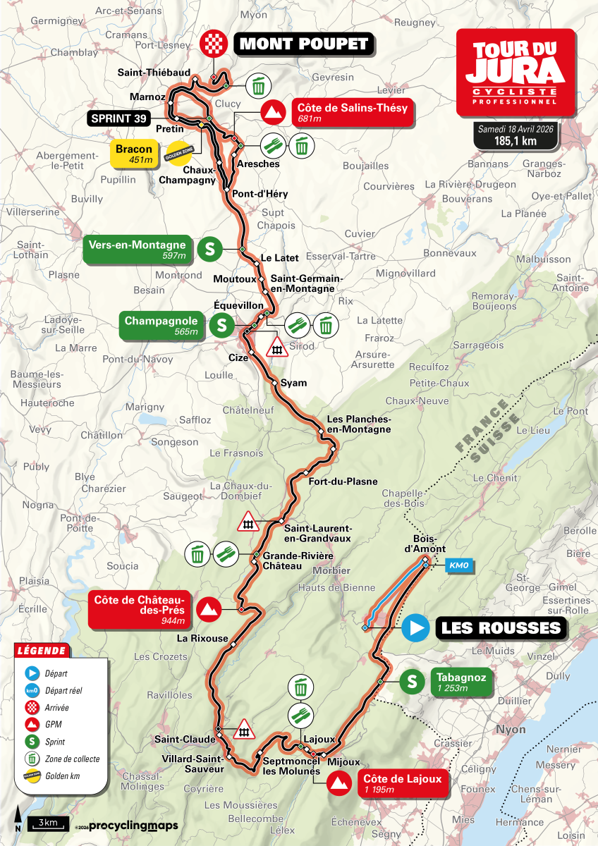 La 23e édition du Tour du Jura Cycliste (1.1), sixième manche de la FDJ United Series, se dispute ce samedi 18 avril. 185,1 kilomètres seront au menu entre les Rousses et le Mont Poupet. Le départ fictif sera donné à 11h10 et le réel à 11h30. Le vainqueur succédera au palmarès à Guillaume Martin-Guyonnet.