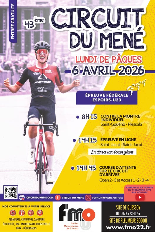 Le 43e édition du Circuit du Mené (Fédérale Espoirs) se dispute ce lundi 6 avril. Un contre-la-montre individuel suivi d'une étape en ligne figurent au programme de la course bretonne. Le vainqueur succédera à Louka Lesueur. Toutes les informations sur www.circuitdumene.com.