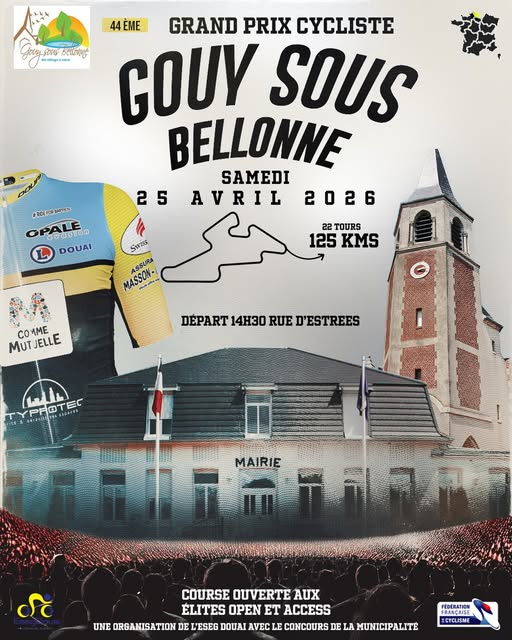 La 44e édition du Grand Prix de Gouy-sous-Bellonne se dispute ce samedi 25 avril dans le département du Pas-de-Calais. Au programme de la course organisée par l'ESEG Douai : un circuit de 5,7 km à effectuer 22 fois soit 125,4 kilomètres. Le départ de l'épreuve Élite, Open et Access sera donné à 14h30. Le vainqueur succédera au palmarès à Bastien Pichon.